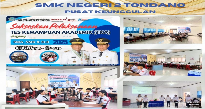 SMK Negeri 2 Tondano Melaksanakan Kegiatan Tes Kemampuan Akademik (TKA) bagi Siswa Kelas 12 Yang sudah mendaftarkan diri dan siap mengikuti TKA. Kegiatan ini kedepan akan menjadi tolak ukur bagi siswa-siswi yang akan masuk perguruan tinggi negeri dan bisa juga digunakan sebagai bahan pertimbangan dalam melamar di dunia kerja/dunia industri.